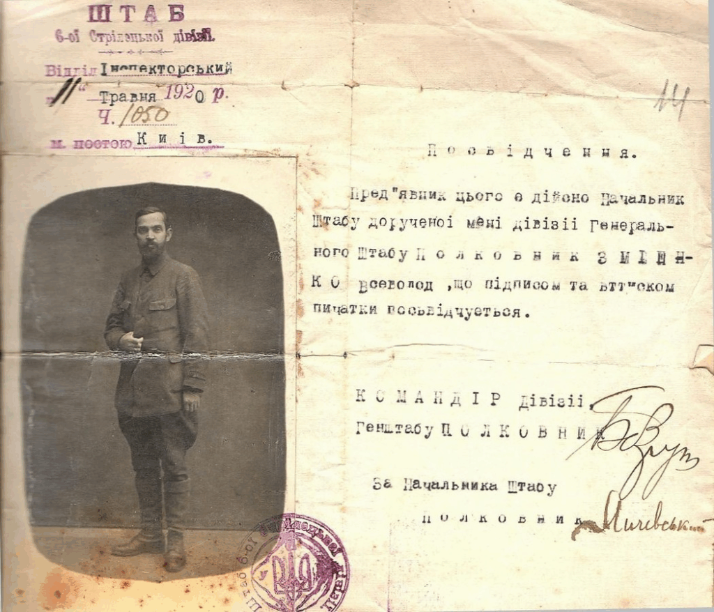 Всеволод ЗМІЄНКО (16 жовтня 1886, Одеса, – 30 жовтня 1938, Варшава) – одесит, легендарний генерал-хорунжий армії Української Народної Республіки. Військовий комендант Одеси у роки Української демократичної революції. Засновник української розвідки. Служив у 59-му Люблінському полку (Одеса), з 20.12.1917р. – начальник штабу Одеської гайдамацької дивізії військ Центральної Ради. З 01.03.1918р. військовий комендант Одеси. Після цього займав низку керівних посад в органах військового управління. ф о т о з а р х і в у С л у ж б и з о в н і ш н ь о ї р о з в і д к и У к р а ї н и