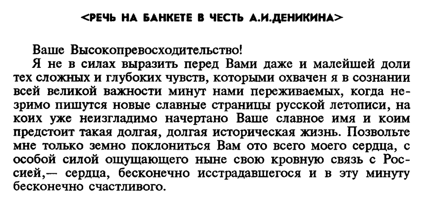 Приїзд А. Денікіна до Одеси він супроводив у газеті словами: ««Будь благословен Твой ратный путь, Надежда России». Бунин Ив. В этот день // Южное слово. 1919. 25 сент. (8 окт.). № 29. С. 1. Приветствие акад<емика> Ив.А. Бунина <Главнокомандующему Вооруженными силами Юга России А.И. Деникину на банкете в честь его приезда в Одессу> // Южное слово. 1919. 28 сент. (11 окт.). № 32. С. 2. “Позвольте мне только земно поклониться Вам ото всего моего сердца, с особой силой ощущающего ныне свою кровную связь с Россией, — сердца, бесконечно исстрадавшегося и в эту минуту бесконечно счастливого” Южное слово. — 1919. — 11 октября (№ 32). — С. 2.