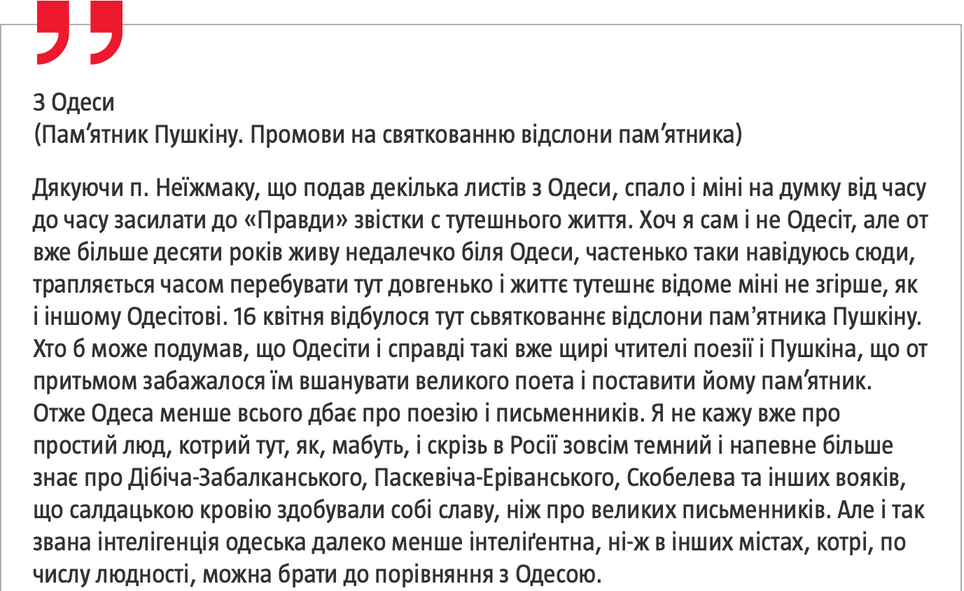 МІФ ПЕРШИЙ: Кошти на пам’ятник ПУШКІНУ зібрали самі одесити, а не місцева влада чи російська імперія. Сам текст без приміток опубліковано Ігорем СТАМБОЛОМ в журналі “Український тиждень” за посиланням. СПРОСТУВАННЯ: – У 1889 році лідер одеської української громади Михайло КОМАРОВ, в часописі галицьких народників “ПРАВДА”, під псевдонімом “Хуторянин” опублікував текст, присвячений процесу відкриття та збору коштів на пам’ятник: “3 Одеси (Пам’ятник Пушкіну. Промови на святкованню відслони пам’ятника). Наводимо уривок з цього тексту: “Так саме і Одеса : величезне місто с трьох міліоновим щорічним бюджетом за 10 років ледве збилося на якихсь там 20 тисяч на пам’ятник, та й то, дякуючи великій енергії “славянского благотворительного общества”, котре і до городян не раз покликувало, і само щиро збірало складки, і міську управу частенько турбувало і навіть до ґенералґубернатора за підмогою оберталося, поки сяк-так розгорювалося на ті бідолашні 20 тис. руб.”.