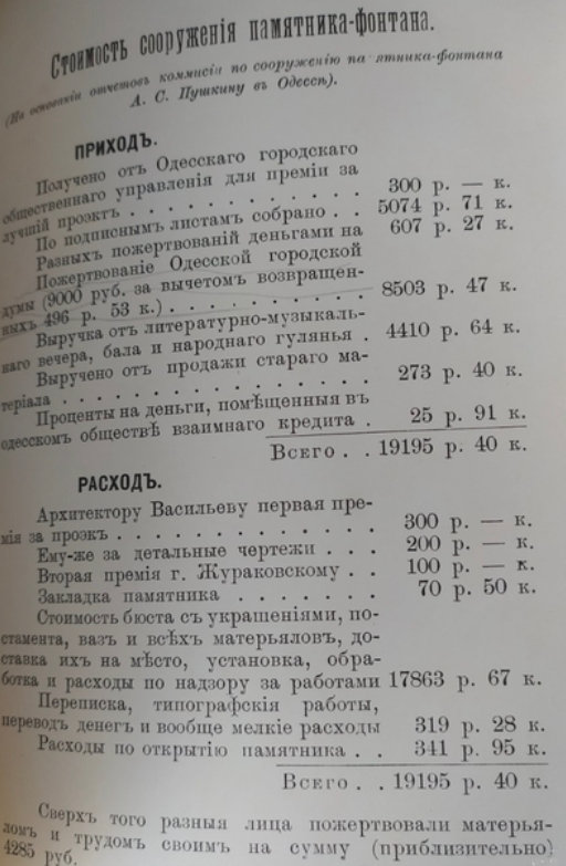 МІФ ПЕРШИЙ: Кошти на пам’ятник ПУШКІНУ зібрали самі одесити, а не місцева влада чи російська імперія. Примірник цієї брошури ви можете побачити в музеї-кав’ярні Петра та Ольги МАНЕЛІС “Стара Одеса”, що на розі провулку КРАСНОГО та вулиці ГРЕЦЬКОЇ. СПРОСТУВАННЯ: Крім того, згадане у статті Михайла КОМАРОВА “Славянское благотворительное общество” у 1890 році видало брошуру під назвою “Открытіе Памятника-Фонтана ПУШКИНУ” з детальним кошторисом збору, з якого видно, що з 19195 руб. 40 коп, 9000 руб. на нього дала одеська дума. 607 рублів 27 коп. зібрали одесити і по підписним листам було зібрано 5074 руб. 71 коп. При цьому міська дума дала на пам’ятник 9000 руб. вже після того, як було остаточно зрозуміло, що зібрати гроші з громади буде неможливо.